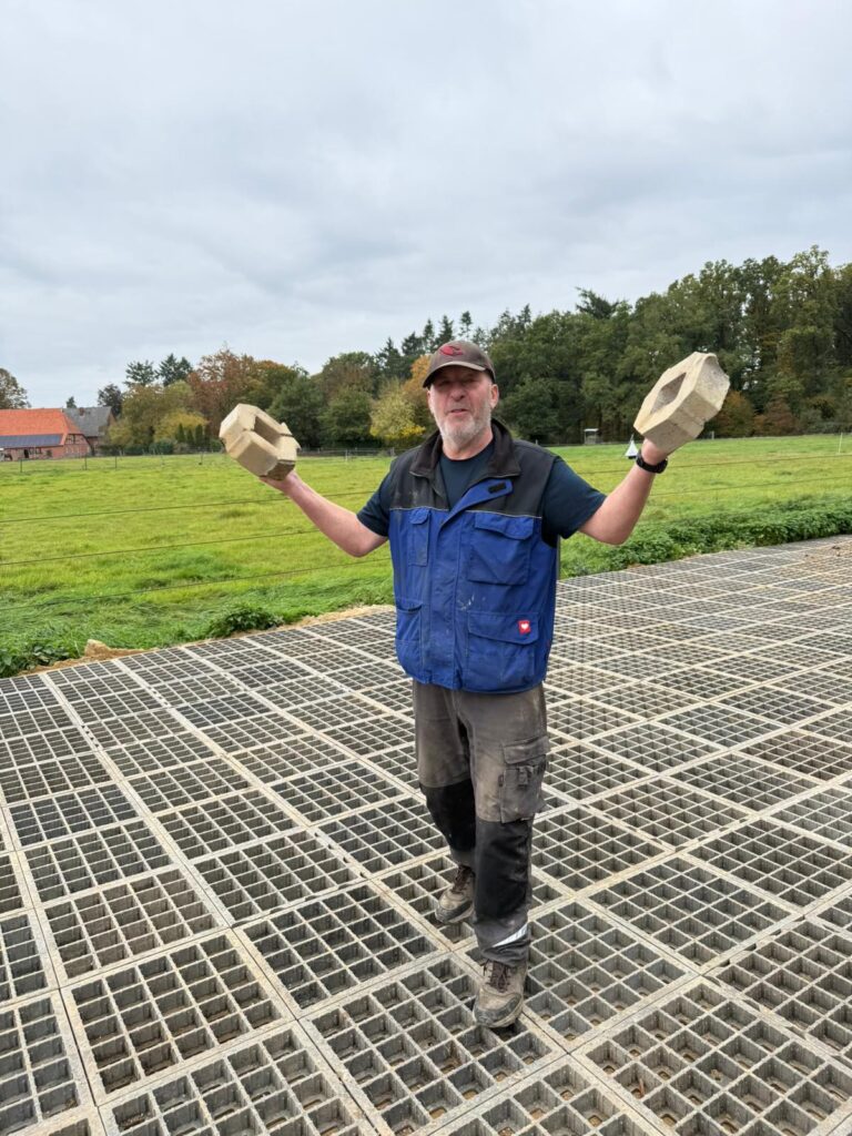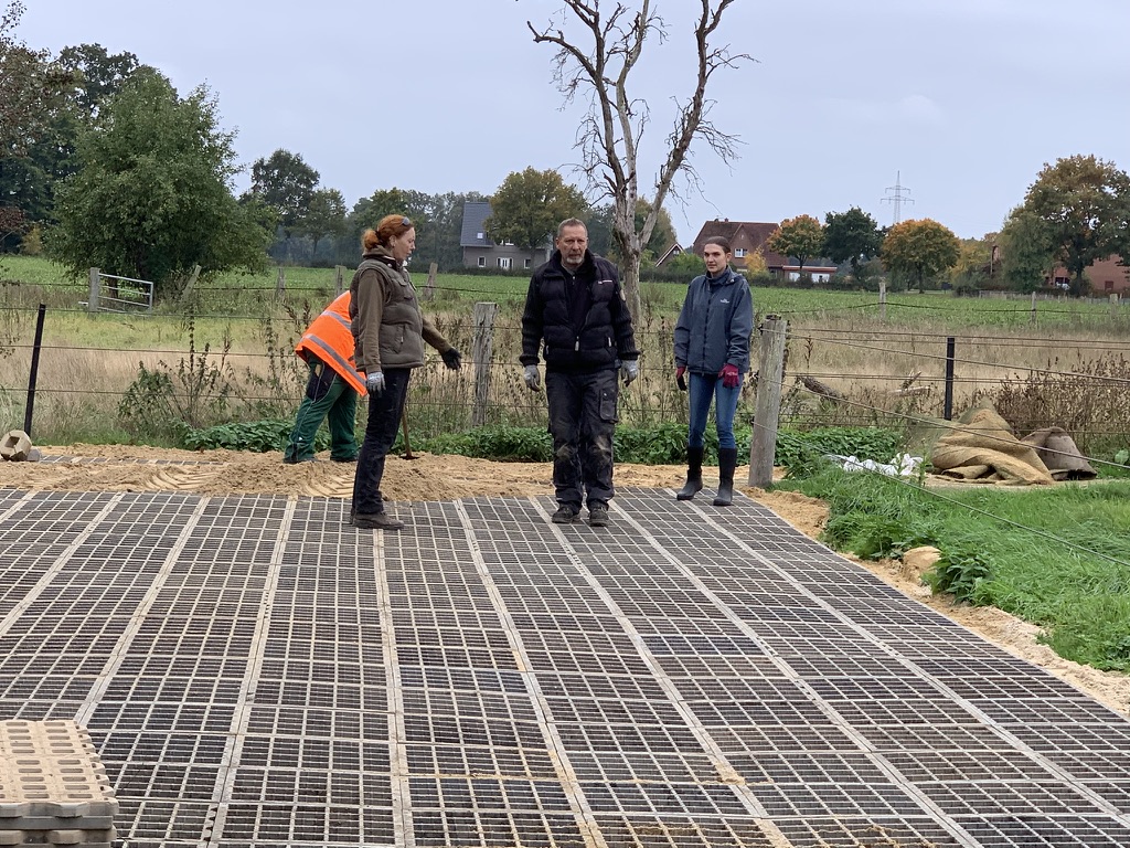 Im Oktober wurde die dringend notwendige Raufenplatz-Befestigung mittels Paddockgittern im T1 mithilfe von Einstellern realisiert. Die Bodenbefestigung der Paddockflächen und des Trails auf dem die Pferde immer laufen können sollen ist ziemlich aufwändig. Wir wollen ja erstmal feststellen wie der Boden sich so verhält. Also wo Befestigung zwingend notwendig ist und welche Flächen wir eventuell auch natur lassen können. Allerdings haben wir bereits die Erfahrung gemacht das es im Herbst und Winter hier so gut wie durchgängig regnet und damit nahezu alles was nicht befestigt ist in Schlammlöcher verwandelt während es dann im Frühjahr und Sommer dafür gar nicht mehr regnet und die Böden dann so austrocknen das zum Einen kein Gras mehr nachwächst und zum Anderen die Staubbelastung ungesunde Ausmaße annimmt. Ganz davon abgesehen hat diese Staubentwicklung unserer Nachbarin den Kaffeegenuss auf ihrer Terasse versaut und ist sogar in ihr Haus eingedrungen. Worauf eine berechtigte Bitte zur Findung einer adäquaten Lösung an uns herangetragen wurde.